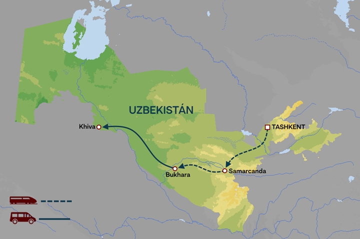 Este es un viaje de contenido cultural sin ninguna dificultad especial. Uzbekistán tiene un rico patrimonio arquitectónico y cultural que afortunadamente se ha podido preservar a través de los siglos. En este viaje seguiremos la ruta clásica monumental, desplazándonos cómodamente mediante dos trayectos en tren y un trayecto en autobús, lo que nos permitirá disfrutar del paisaje y del viaje entre las ciudades de Tashkent, Samarcanda, Bukhara y Khiva.