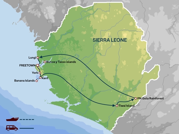 Este itinerario por Sierra Leona combina historia, naturaleza y cultura en un recorrido intenso y enriquecedor. Desde la vibrante capital Freetown hasta las islas históricas de Bunce y Tasso, pasando por santuarios de vida salvaje como Tacugama y espacios naturales únicos como Tiwai y el Parque Nacional de Gola, el viaje ofrece también momentos de relax en playas vírgenes y pueblos costeros. Una propuesta ideal para quienes buscan una experiencia auténtica y poco convencional en África occidental.