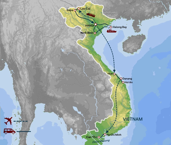 - Vuelos domésticos Hanoi / Hue y Danang / Ho Chi Minh.